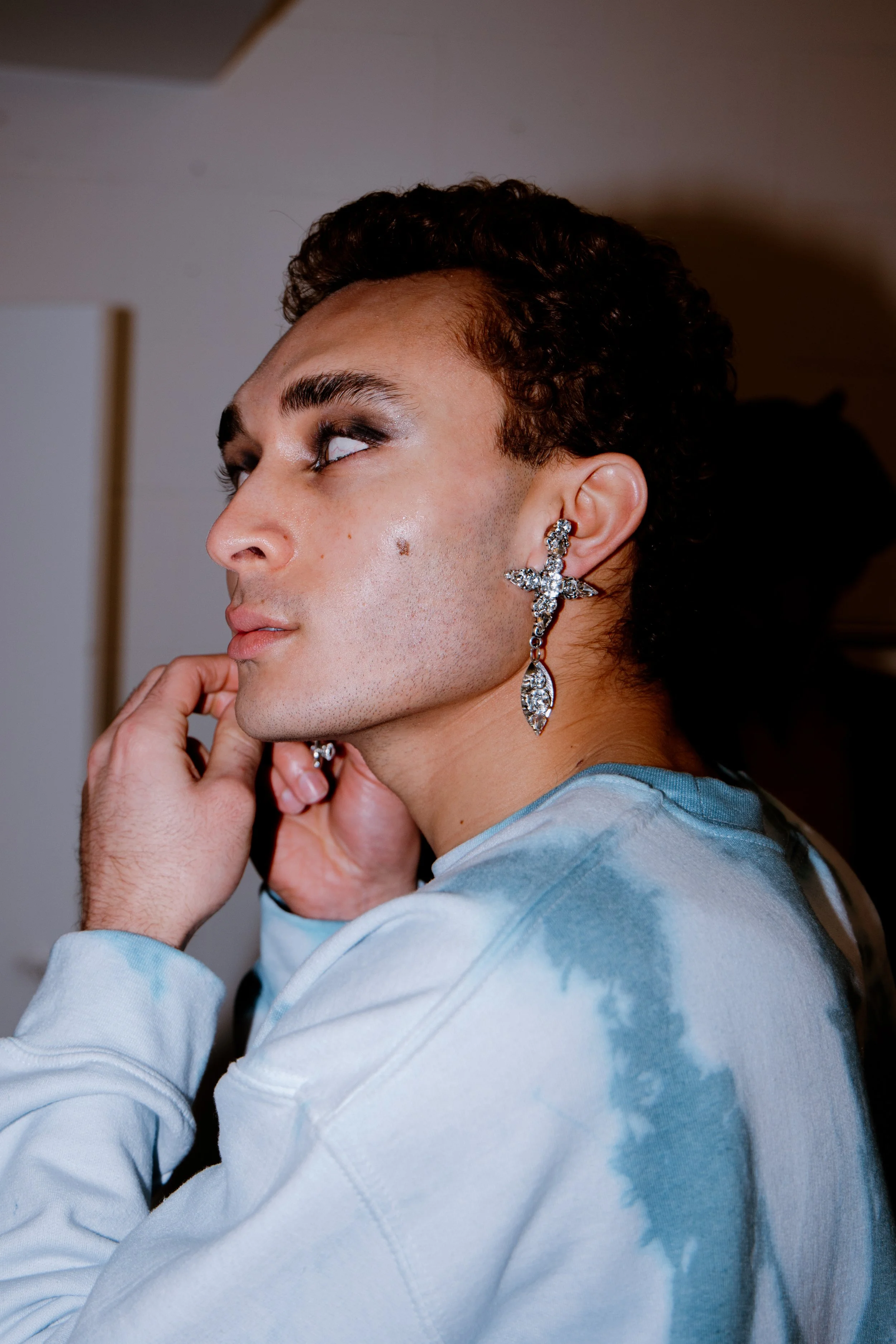 The first piece I made was a necklace, a statement piece shaped like a jeweled snake head, roughly the size of a fist. It was built by hand, covered in glass stones soldered one by one, meant to hang heavy against the body. It appears in the final look. From there, the rest of the metalwork followed the same process: hand-soldered, flame-built from raw crystal and metal, fused rather than cast. They were designed with precision and intention, yet given the identity of objects that felt ancient, mythical artifacts weathered by time but still deeply shining, carrying both the illusion of history and the weight of something sacred.