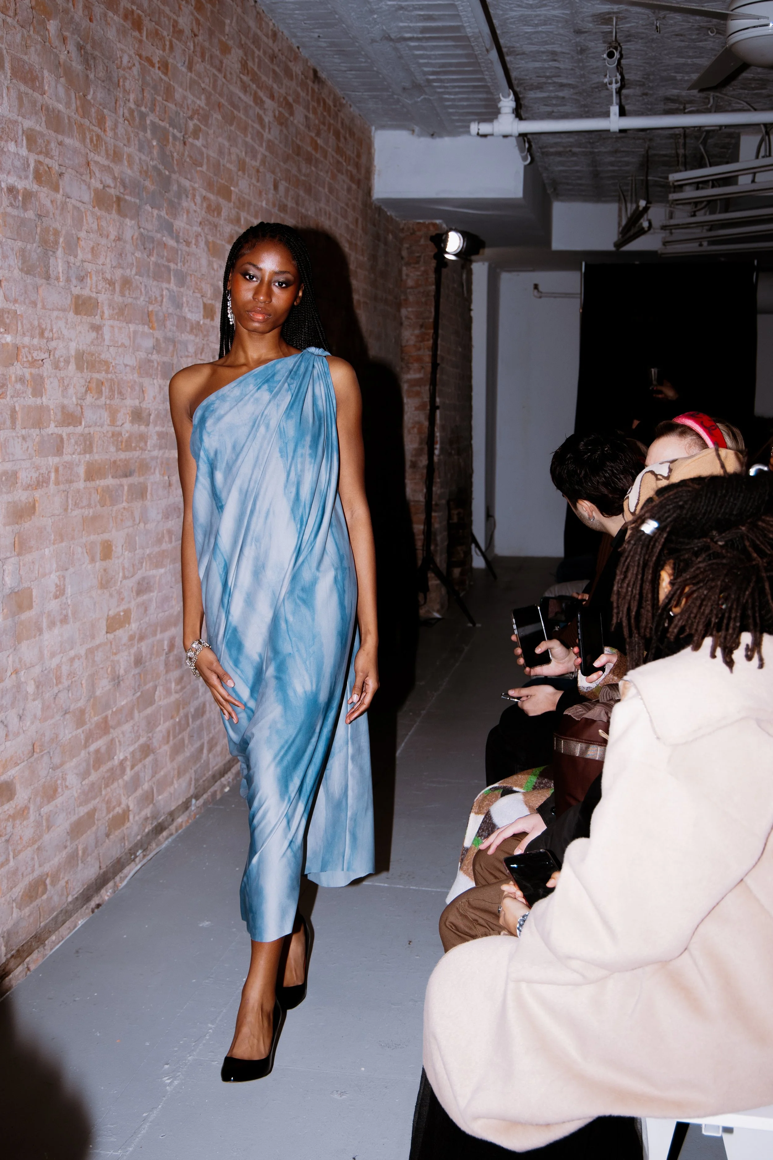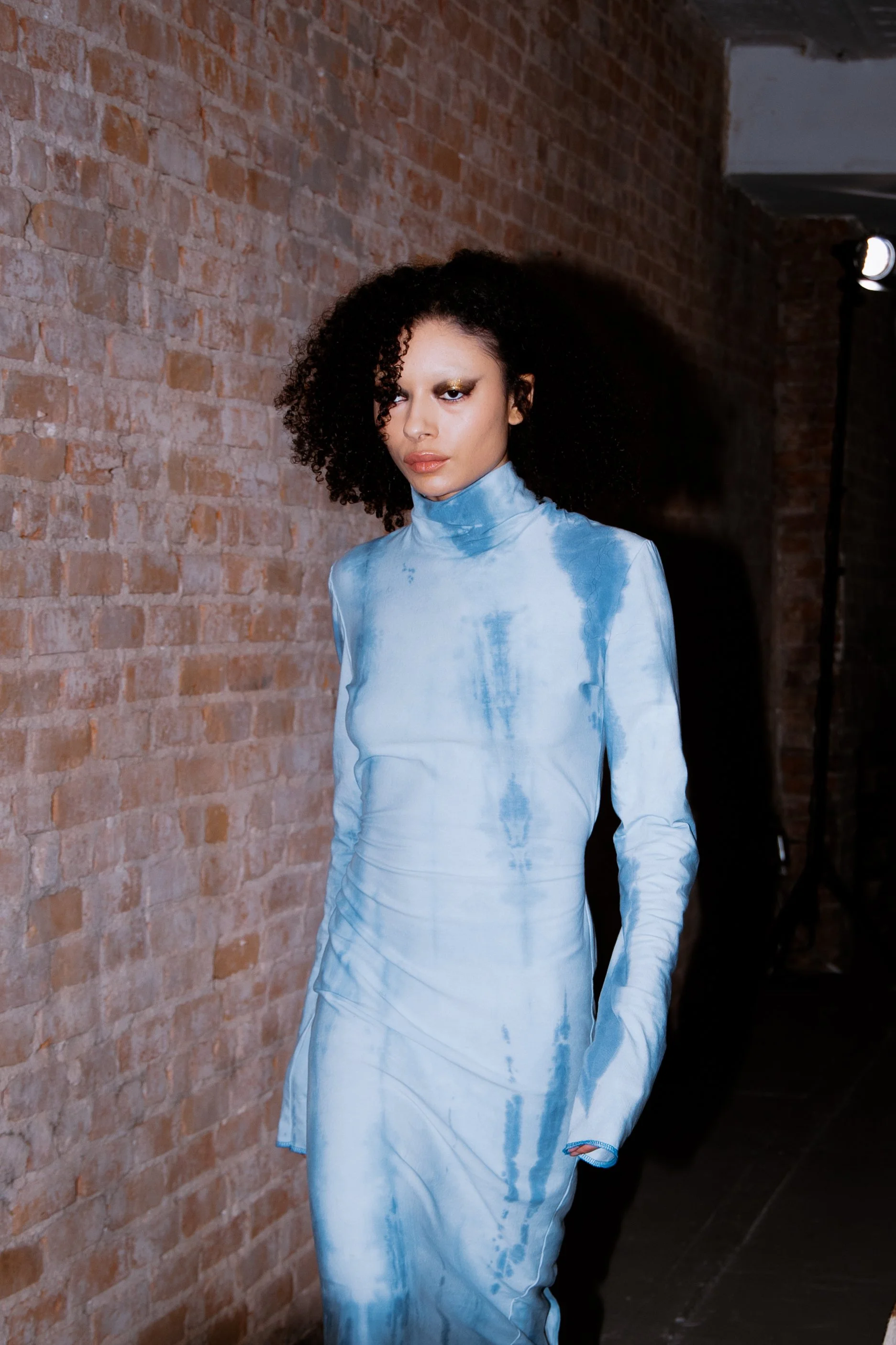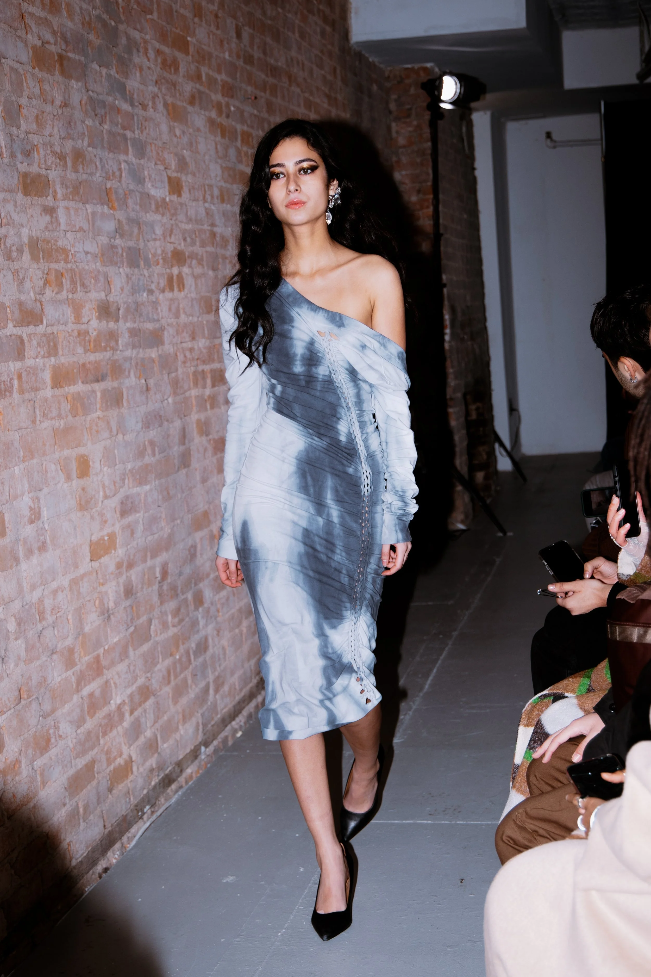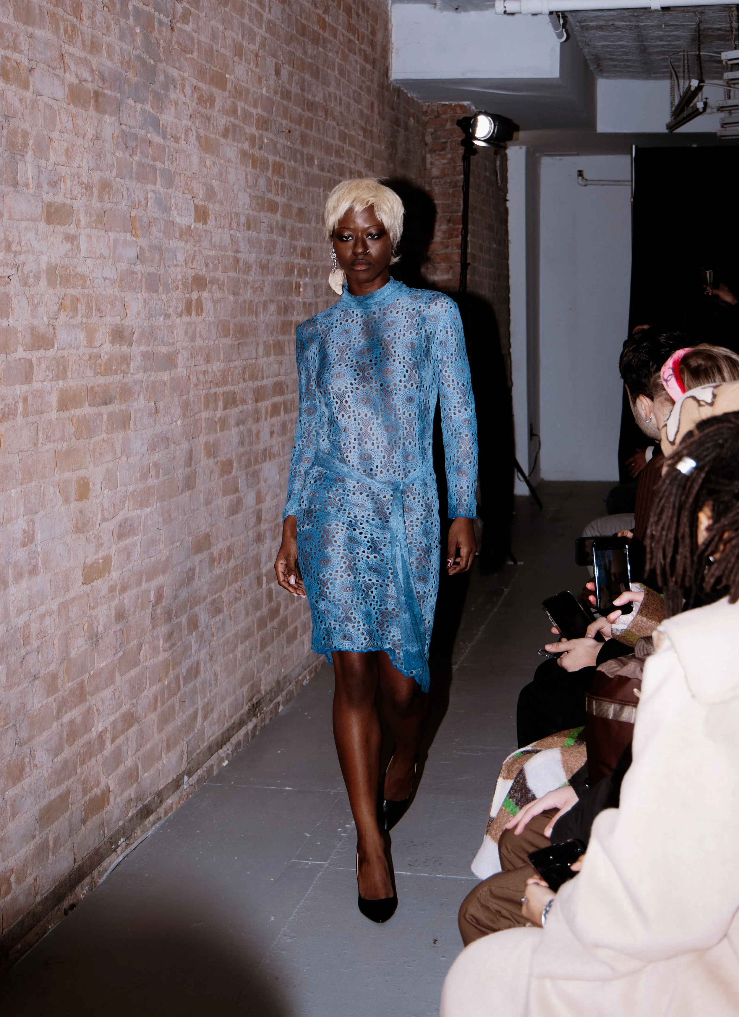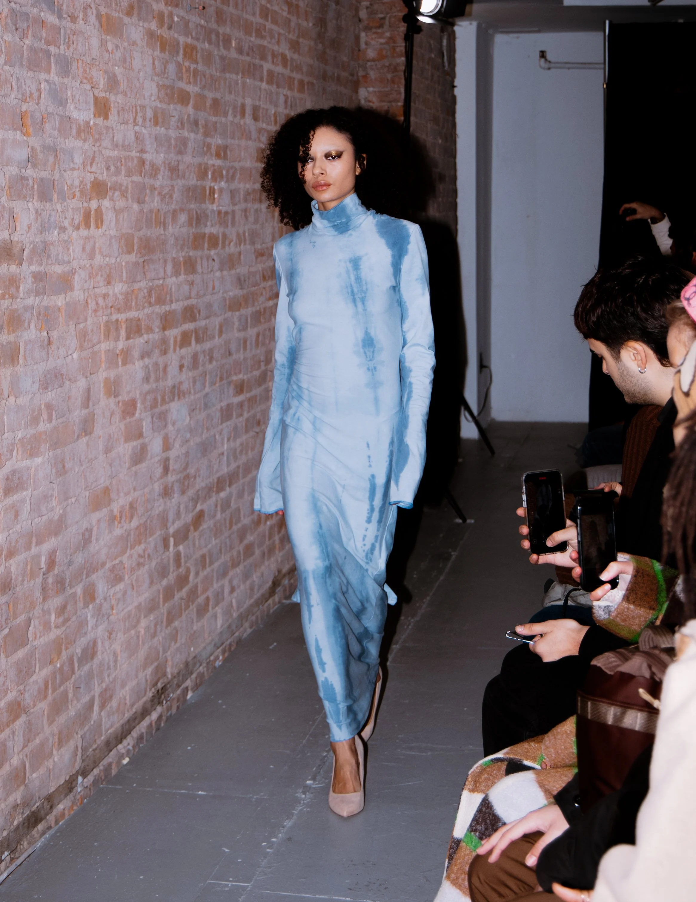 Materials shifted between fragile and heavy, soft jersey, embroidered lace, and a faux fur coat so dense it almost pulled the model down. It didn’t. Lined with black chainmail, it became its own paradox: softness reinforced from within. Every piece was hand-dyed, some edged in bright electric blue, a mistake that refused to disappear and eventually became a signature of the collection.
