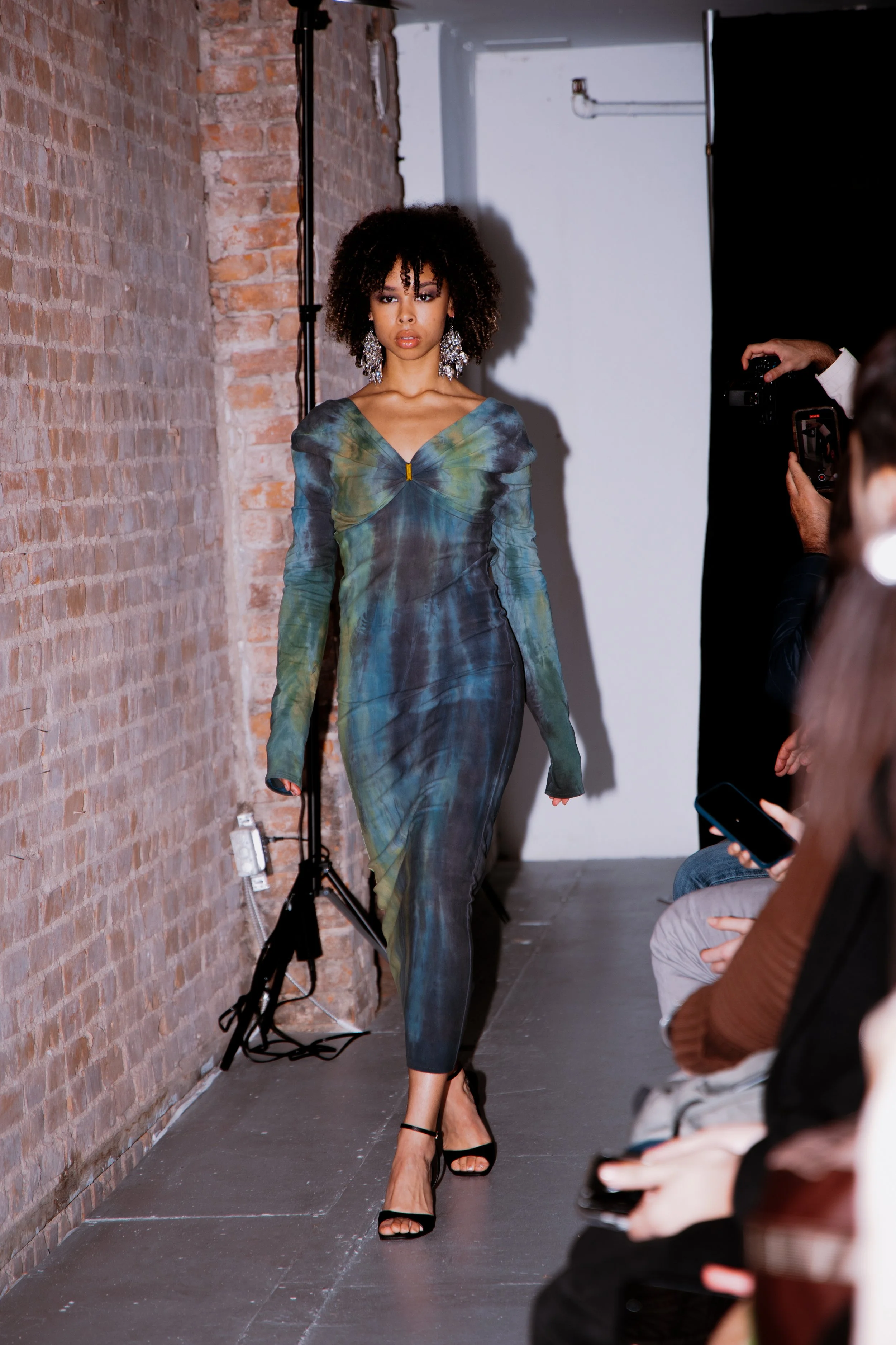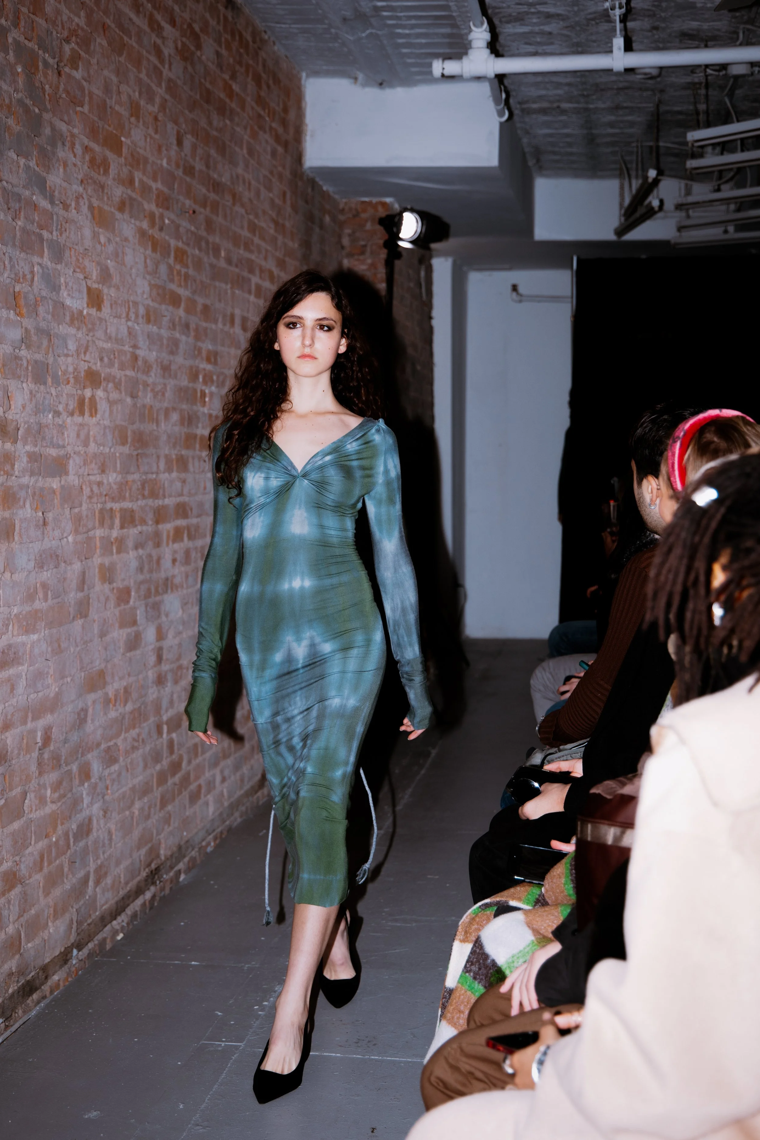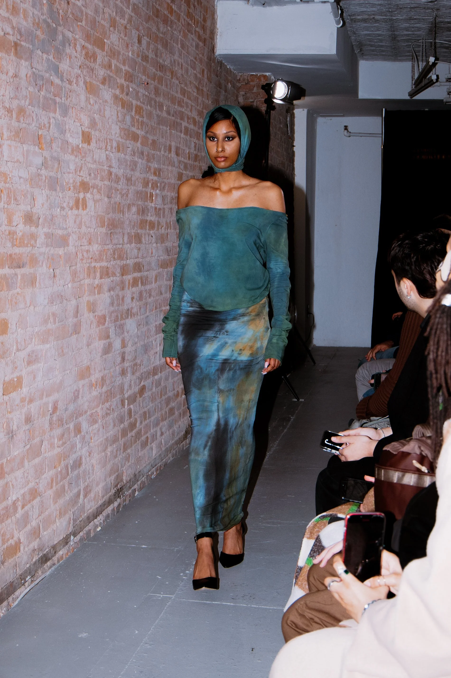 The concept originally centered around a soldier, a woman lost in the jungle, stumbling upon an ancient temple filled with relics and spiritual debris. But over time, that soldier stopped being a separate character and revealed herself as her, the CICAEDIA woman, gone exploring before anyone realized she’d vanished. The jewelry was meant to feel like what she found there: artifacts too heavy to carry but impossible to leave behind, the only tangible evidence of a story that would remain untold. That was the narrative framework for most of the design process, until about a week before the show, when it became clear I wouldn’t have the time or resources to build military garments or fully render that mythology. The idea was stripped back to what I could actually make, a series of hand-dyed jersey pieces, constructed quickly but carefully, bound by their own exhaustion.