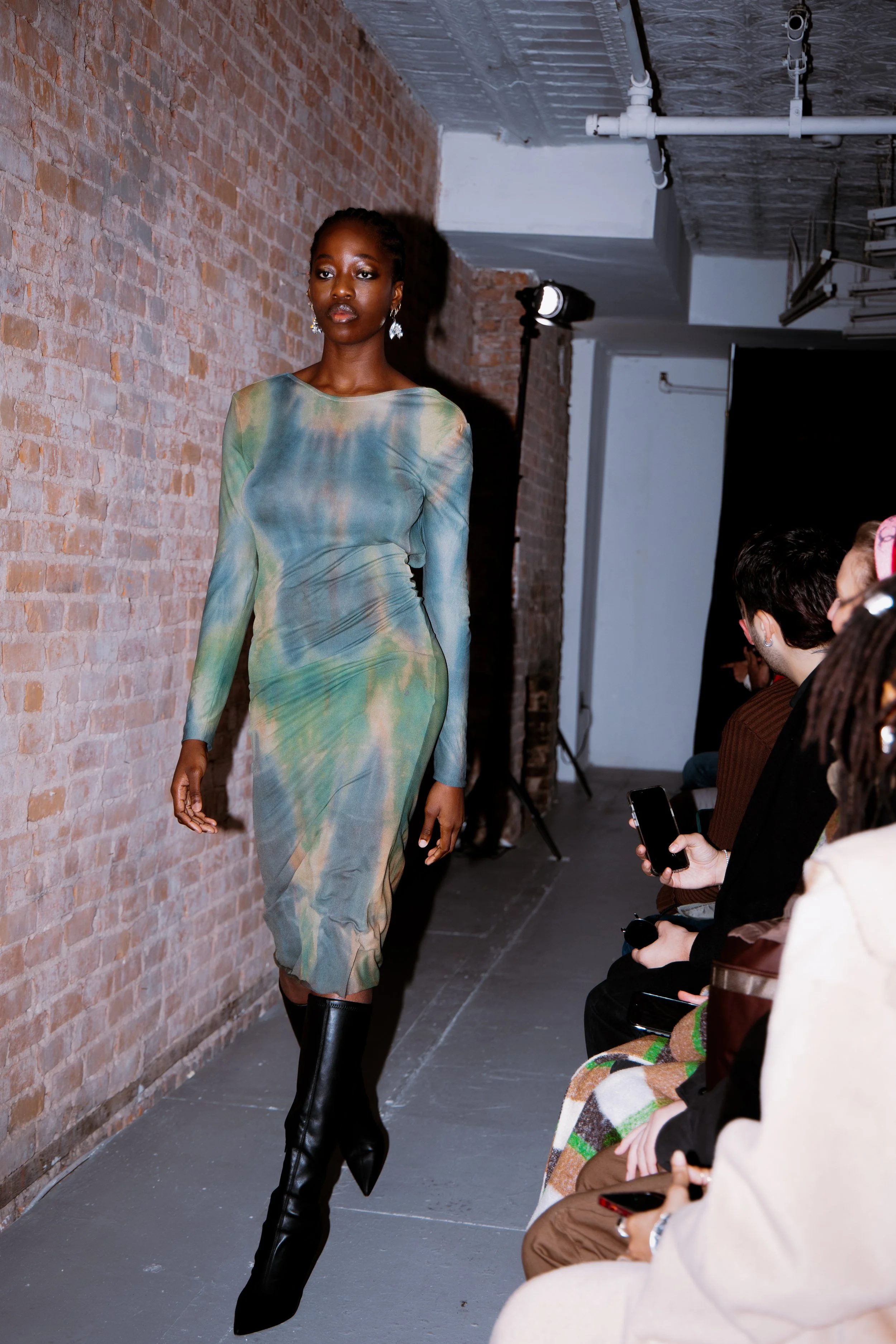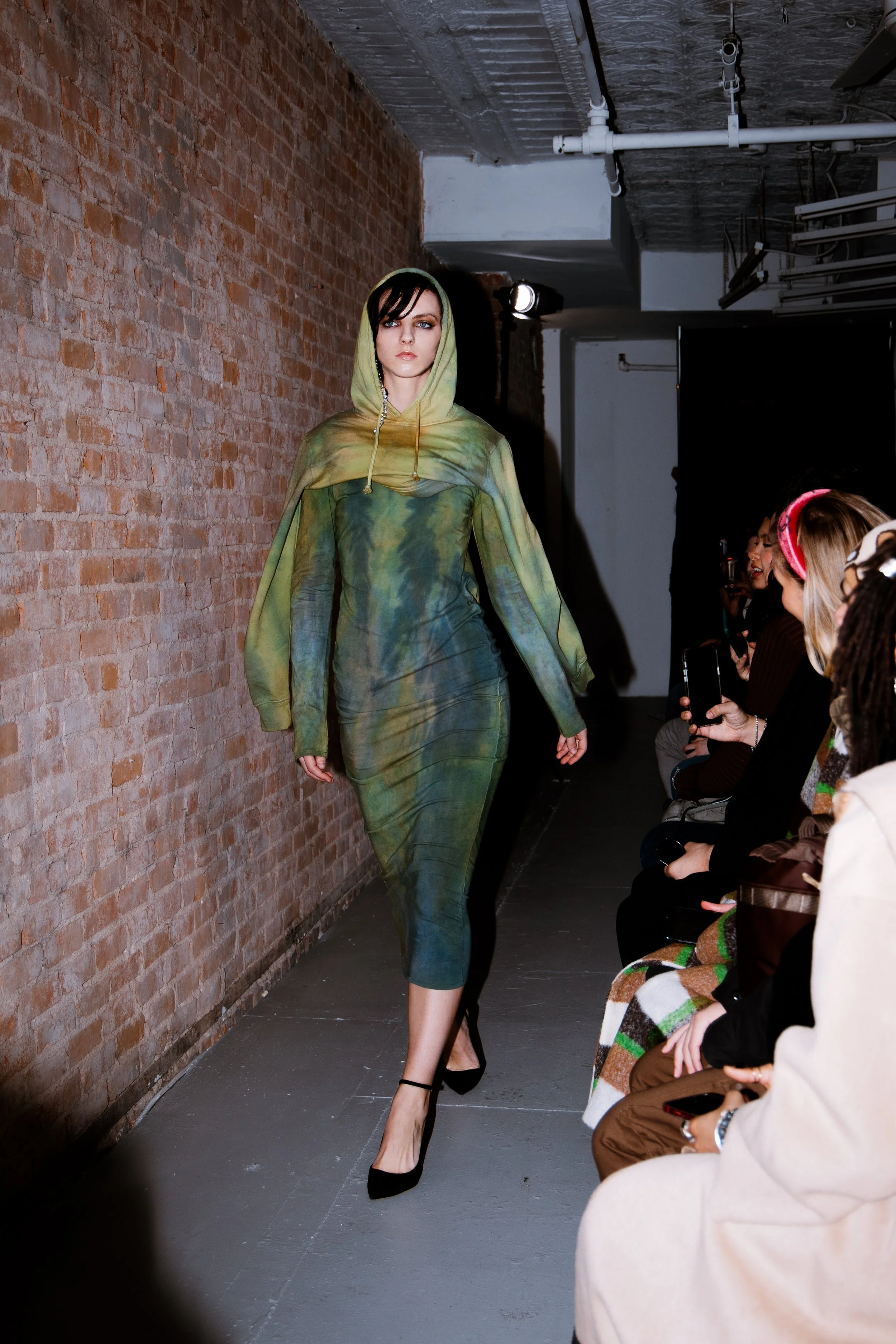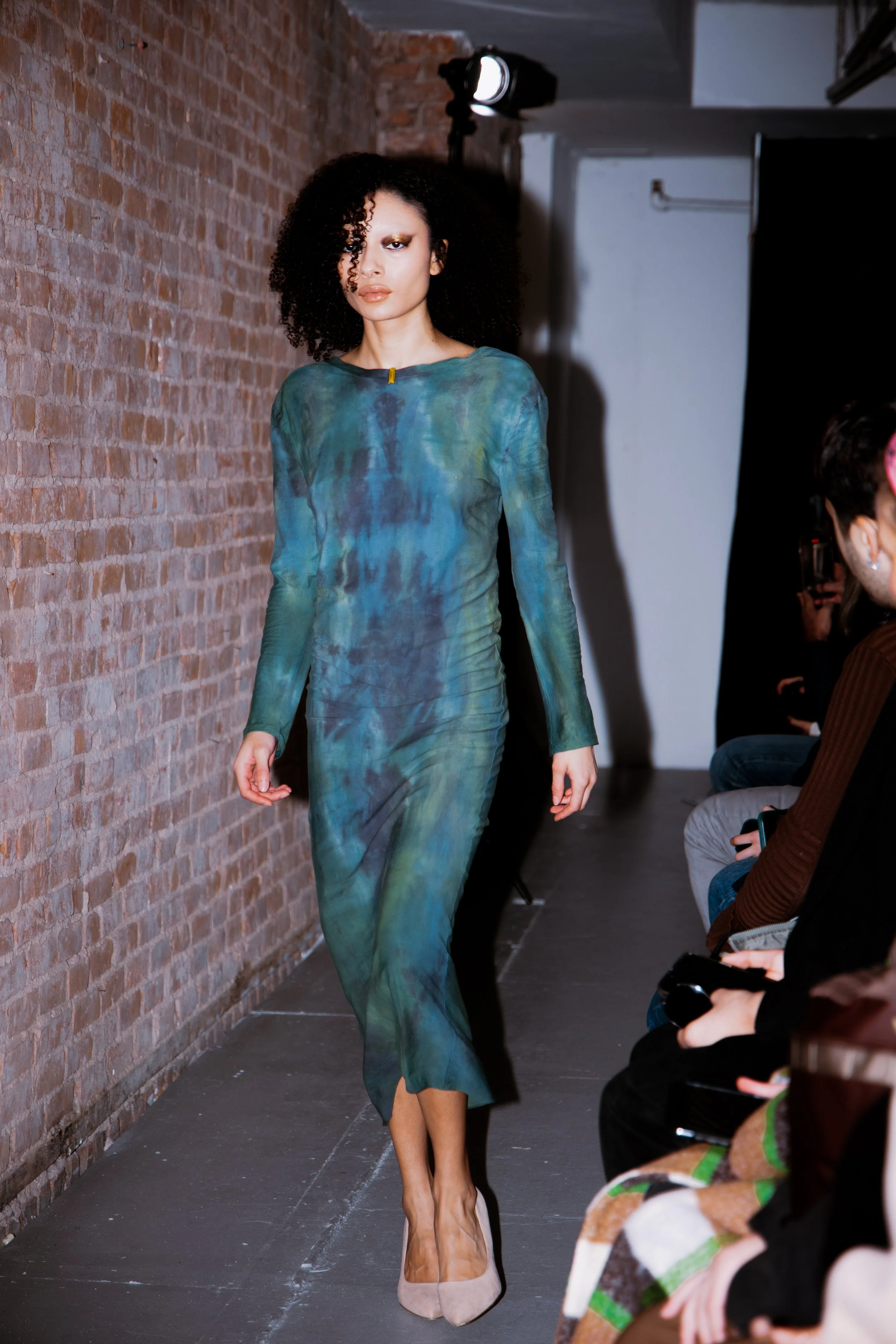 The concept originally centered around a soldier, a woman lost in the jungle, stumbling upon an ancient temple filled with relics and spiritual debris. But over time, that soldier stopped being a separate character and revealed herself as her, the CICAEDIA woman, gone exploring before anyone realized she’d vanished. The jewelry was meant to feel like what she found there: artifacts too heavy to carry but impossible to leave behind, the only tangible evidence of a story that would remain untold. That was the narrative framework for most of the design process, until about a week before the show, when it became clear I wouldn’t have the time or resources to build military garments or fully render that mythology. The idea was stripped back to what I could actually make, a series of hand-dyed jersey pieces, constructed quickly but carefully, bound by their own exhaustion.