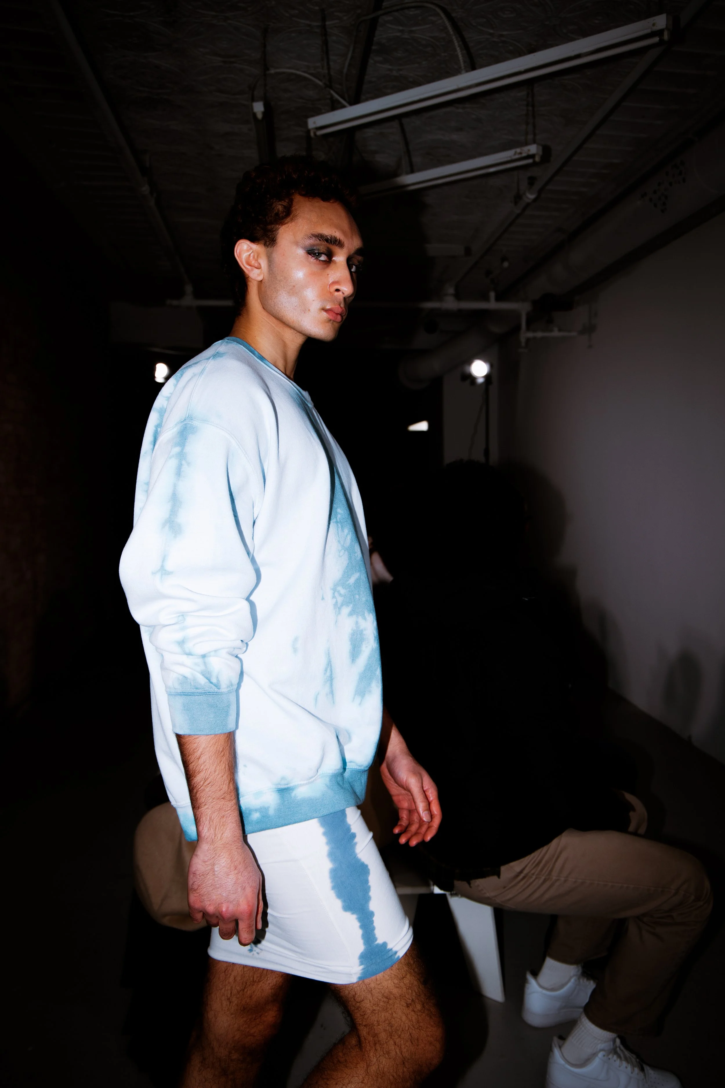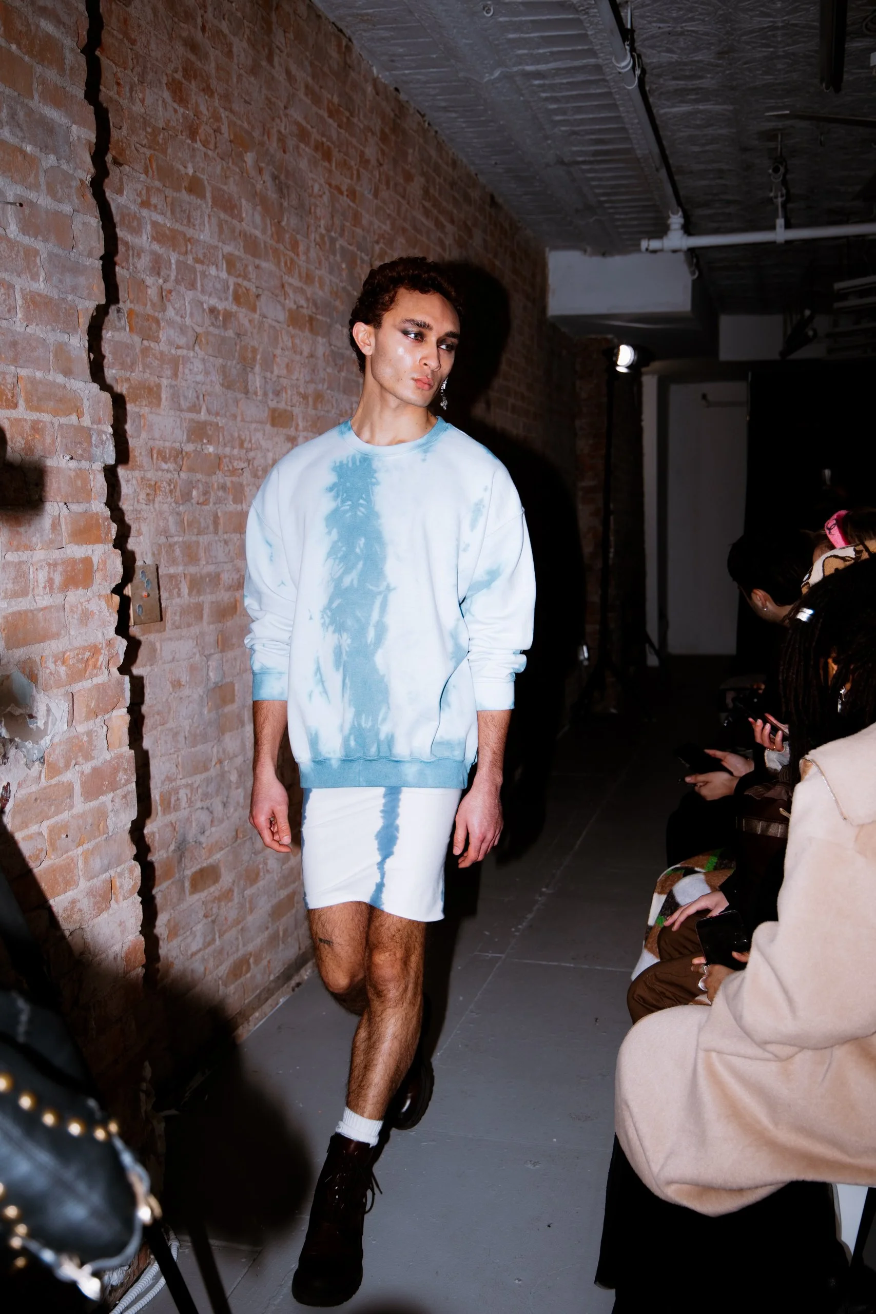 The idea began with queer erasure, what it means to be seen, silenced, or forced to hide in plain sight. The collection started in white, a room of untouched garments that felt sterile and disconnected. Then came color, hand tie-dyed into muted, bruised tones of rainbow. The process was uneven and unpredictable, but that became part of it. The clothes were meant to look like something once vibrant that had faded through time and exposure, a pride flag that had survived too long in the sun. Faded but not erased.