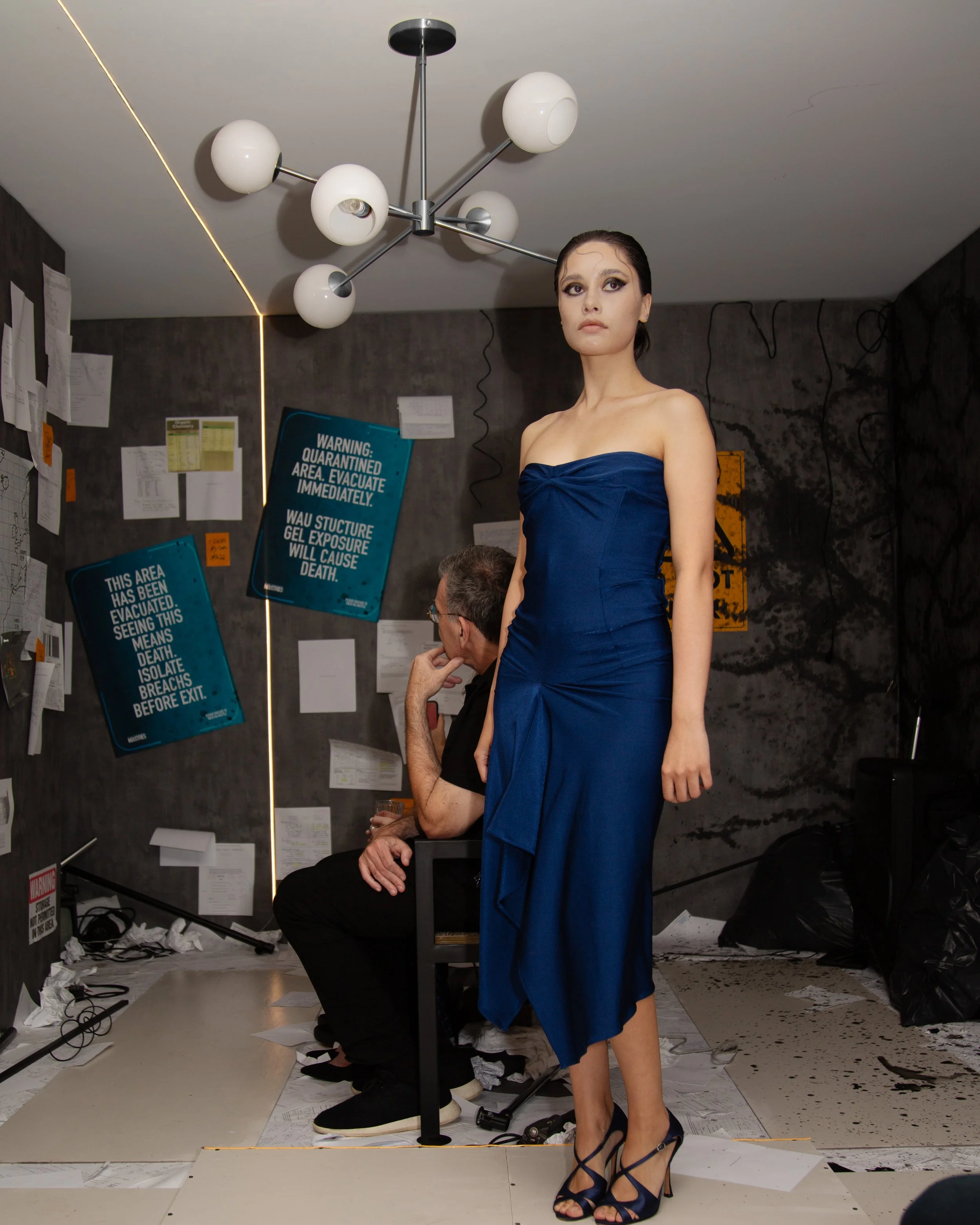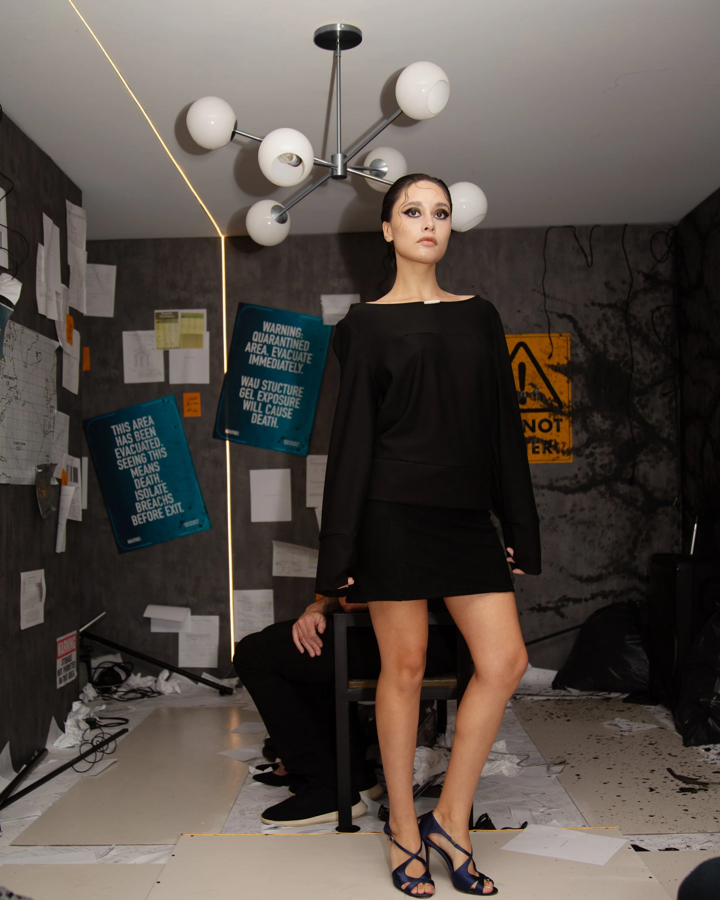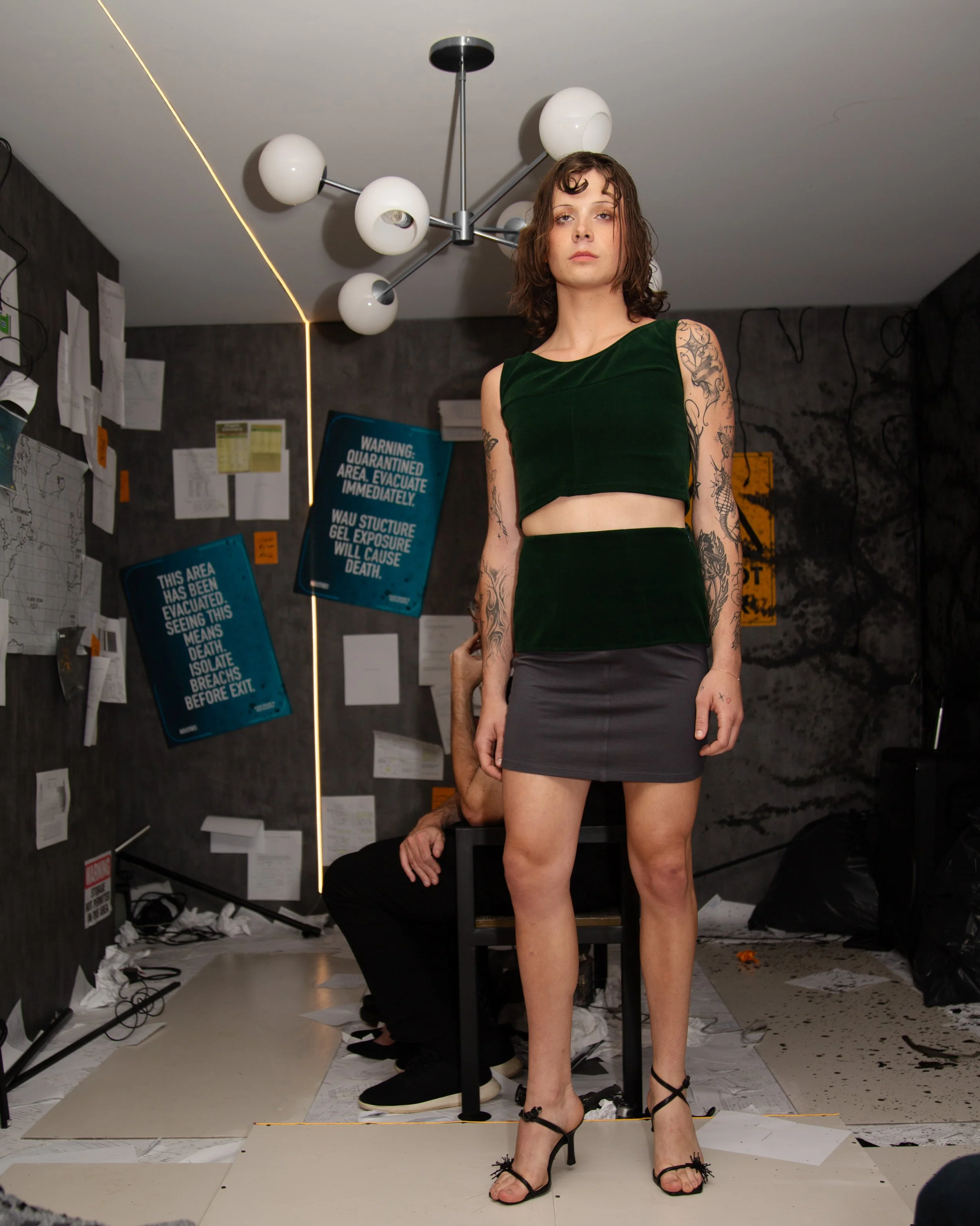 The show took place at Vila Natalia, my family home in Riverdale, NY. My dining room was remodeled for it. I built set walls that partially enclosed the space, creating narrow areas for the models to emerge through. The idea wasn’t to transform it into something unrecognizable, but to distort what was already there. I created a tableau instead of a stage, a single environment that felt like both a home and a lab. The floor was covered in lab equations I stole from my sister. One side of the wall featured blown-up graphics warning about the “black mass,” mimicking the WAU. In reality, it was a hand-painted spiderweb of Mod Podge and sand. It all came together to form a vague visual experience; artificial, textural, faintly unsettling. A domestic space rewritten as a containment scene. I built the entire set alone over the course of three weeks, while sewing the collection and finishing school.
