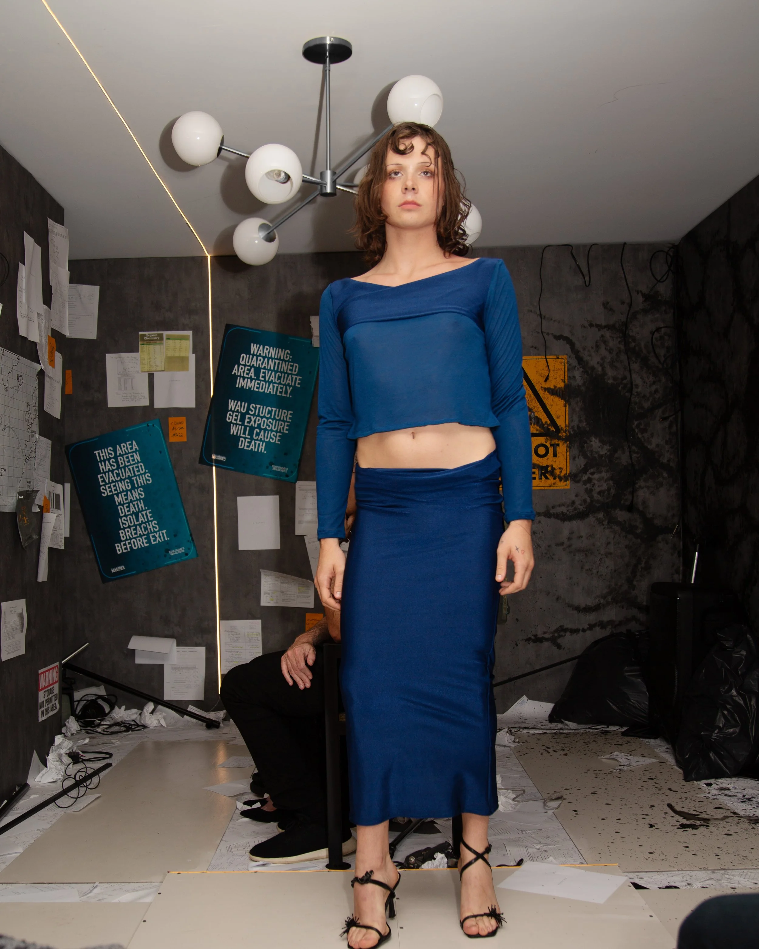Color then seeps in. Toxic greens and dense ocean blues move through wet velvets, plasticky jerseys, and warped nylon. The palette starts sterile and ends contaminated. These materials mimic strength because they are strong, durable, they don’t decay or dissolve the way natural ones do. They last. Permanence as pollution, if you would. At the time, I was working in an environment obsessed with ethical production, where “sustainability” had become a performance, something overexposed, used to justify lazy work and poor design. It frustrated me. I wanted to play with that contradiction: to make something beautiful out of the materials everyone pretended not to use.