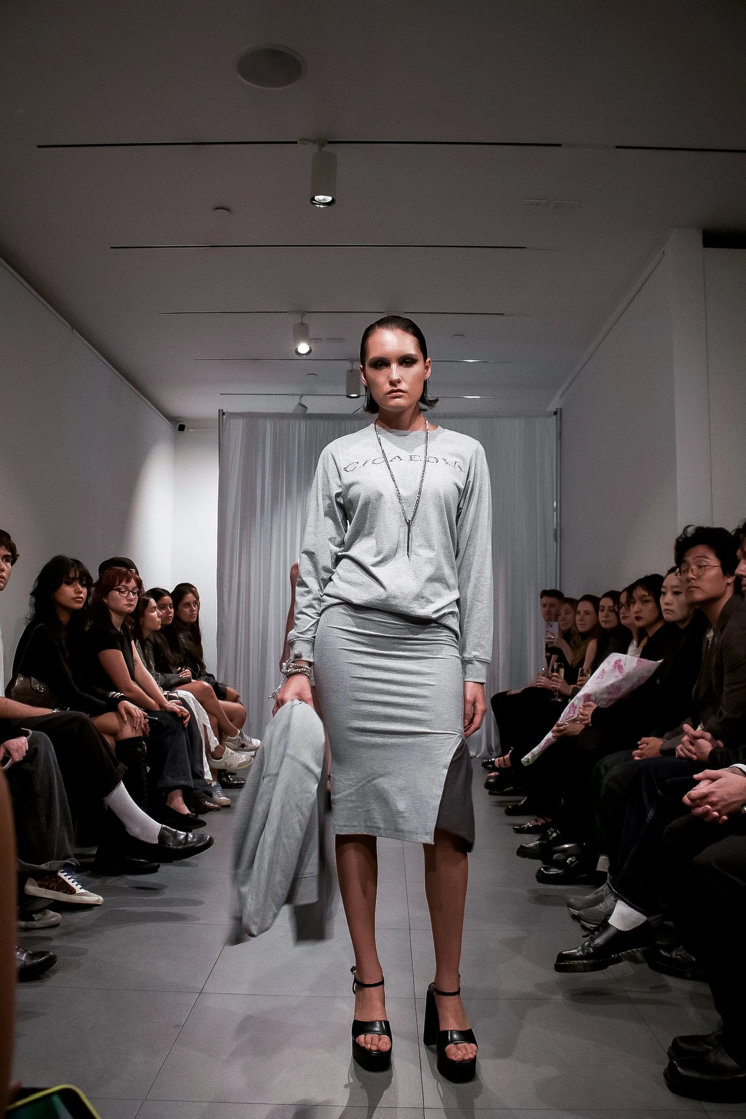 The collection builds around this world. It begins in grey, streamlined, sterile, casual. Oversized hoodies, T shirts, and long sleeves with the rhinestone grey CICAEDIA logo, paired with structured mini and maxi skirts. The skirts are jersey faced and stiffened to hold an angular, controlled shape. The tone is consistent, almost medical.