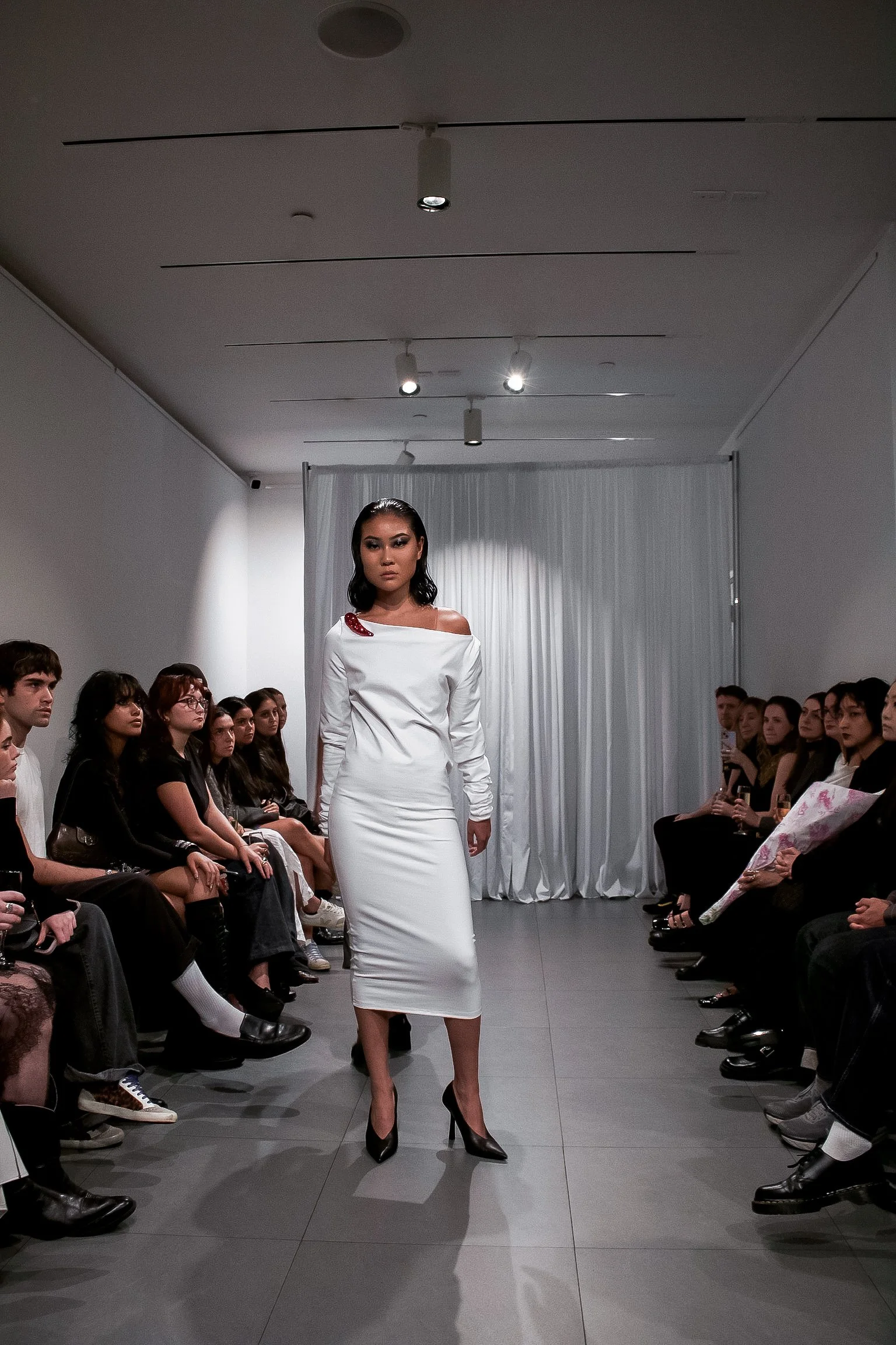 As she walks, the Birth soundtrack returns, “Prologue (Birth)” unfurling through the space, layered with church bells I’d lifted from a 2012 wedding video filmed in Italy and the faintest sound of birdsong. She crosses the runway slowly, deliberately, before disappearing backstage. The soundscape unravels with her exit, the bells fading into silence, the birdsong cutting out one by one, until there is only breath, and then nothing. In that stillness, the intro to Deftones’ cover of “Drive” by The Cars begins, a song that has always felt to me like the most romantically haunting thing ever recorded: melancholic in a way that feels alive, suspended between tenderness and grief. One by one, the rest of the looks return in order, white, red, black, before she emerges again in the wedding gown, closing the show as “Drive” blooms into its full, aching swell. Her final walk is slow and deliberate, a moment of grace coddled from broken internal monologues, a quiet beauty pieced together from something deeply fractured. The show doesn’t end with an exclamation but with a breath, one that feels almost like release.